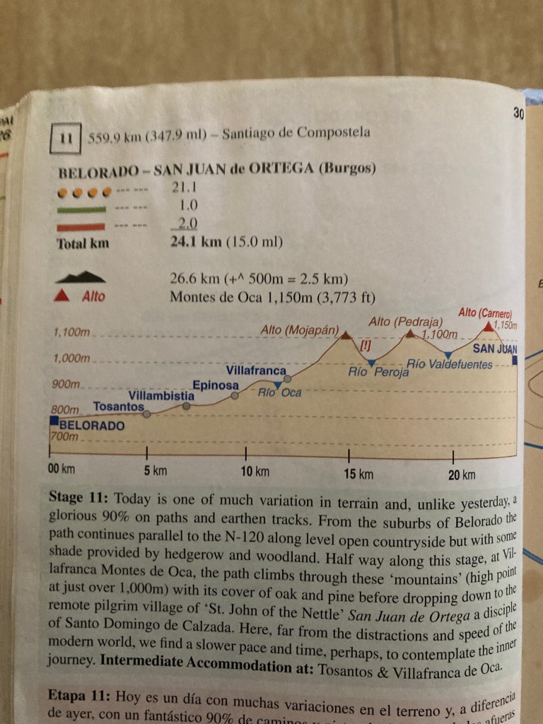 But today was very tough physically. As you can tell from the elevation map it was 3 hills with each one getting higher and higher and higher. There was a brilliant sunshine all day, but the trail went through pine and oak forests, so lots of shade. Today I didn’t walk alone. Walked the morning with Paul from Devon England, then with Ed from Oakville Ontario and then with Omer from Israel, as he said Homer without the H. We helped each other. However when we got to the end in St. Juan de Ortega there were no beds available so we continued on to Ages where we did get beds. Further than planned but makes tomorrow shorter.